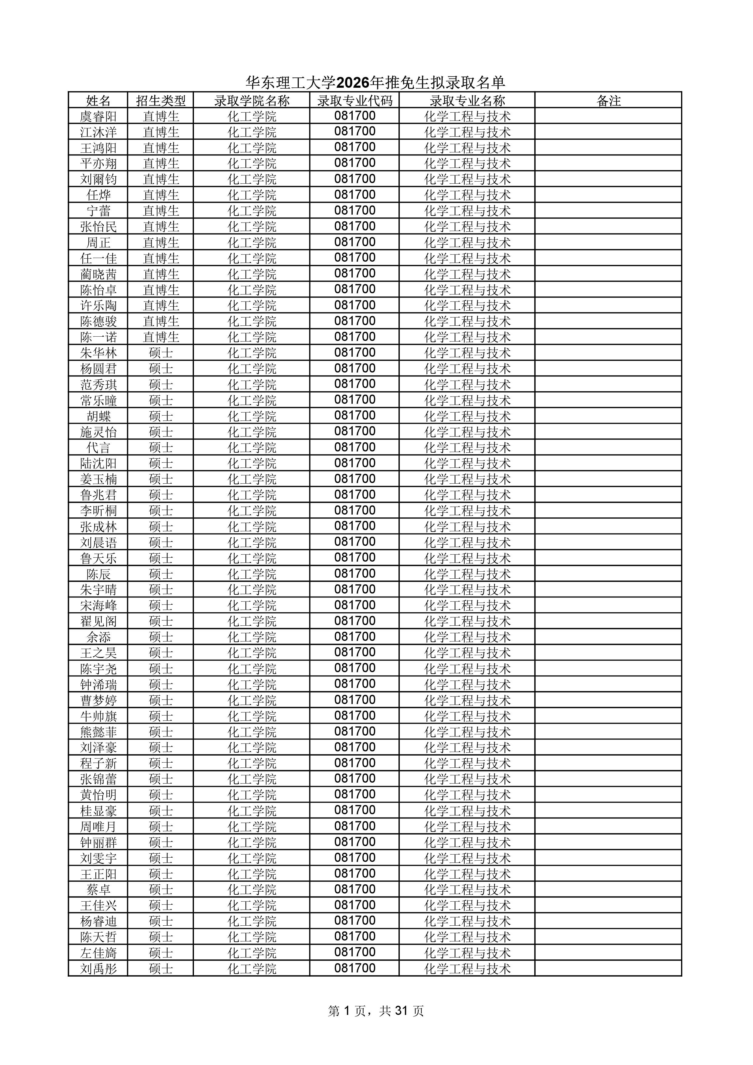 为切实做好推免招生信息公开工作,保证推免工作各个环节公开、透明,按照教育部有关要求,现将我校2026年拟接收推荐免试研究生(含直博生)名单公示,公示期为2025年10月21日至2025年10月27日。公示期间若有异议,可与研究生招生办公室联系,地址:研究生楼811;电话:021-64252453;E-mail:yzb@ecust.edu.cn。