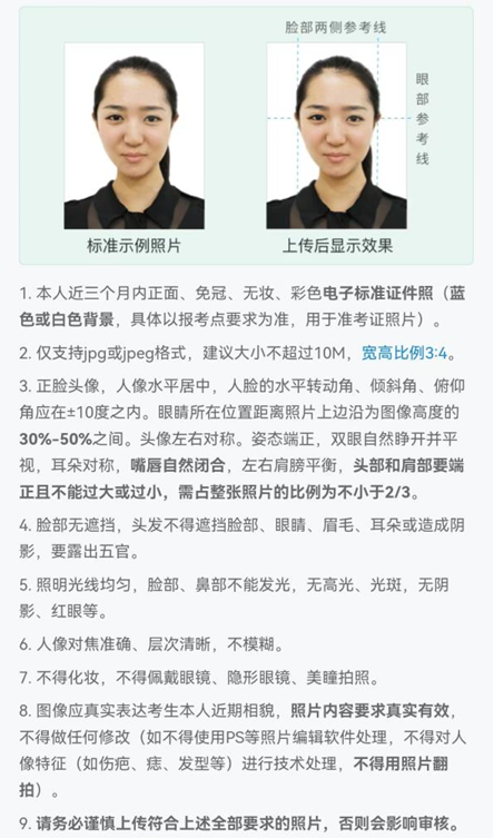 本人近三个月内正面、免冠、无妆、彩色电子证件照。该照片将用于初试准考证、录取登记表、校园一卡通等,请务必按要求上传。照片要求见下图(白色背景):