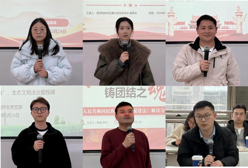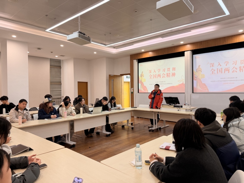 本次联学活动由习研会指导教师、党委研工部戎思淼主持。研讨会上,习研会宣讲团成员、马克思主义学院2025级硕士生党支部副书记钱雨蝶首先介绍了2026年全国两会的基本情况,并结合“大思政课”背景下开展形势政策教育的实际需求,强调当前组织广大研究生学习践行两会精神的重要意义,介绍了围绕两会精神开展理论宣讲的创新方法。商学院研究生第九党支部书记麻译匀和习研会宣讲团成员社会学院2023级博士生佘国梁分别从产业经济学和社会发展理论两个不同角度,介绍了《中华人民共和国国民经济和社会发展第十五个五年规划纲要》中关于“十五五”时期我国在产业经济发展和乡村全面振兴等领域的宏伟蓝图。资环学院碳中和师生党支部副书记袁聪介绍了最新颁布的中国第二部以“法典”命名的法律——生态环境法典的有关情况。化工学院的研究生辅导员阿曼·阿吉老师为同学们解读了《中华人民共和国民族团结进步促进法》对铸牢中华民族共同体意识、助力民族复兴的重要性。