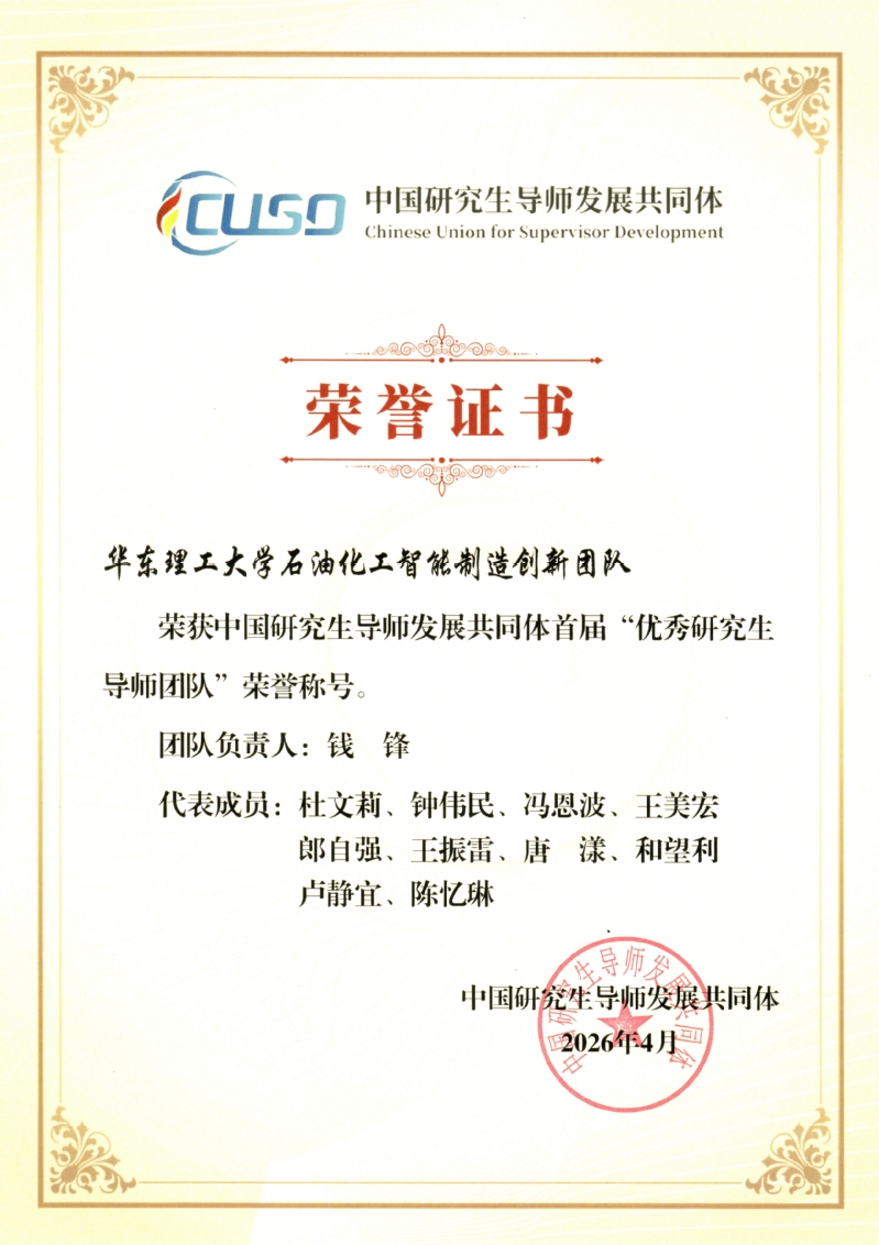 4月19日上午,由中国研究生导师发展共同体主办的首届优秀研究生导师及团队颁奖典礼在江苏苏州举行。我校钱锋院士领衔的“石油化工智能制造创新团队”荣获“中国研究生导师发展共同体优秀研究生导师团队”称号,材料科学与工程学院侯宇教授荣获“中国研究生导师发展共同体优秀研究生导师”称号。两项荣誉的获得,是我校深化研究生教育改革、推进研究生导师队伍建设和高层次人才培养的又一重要成果。